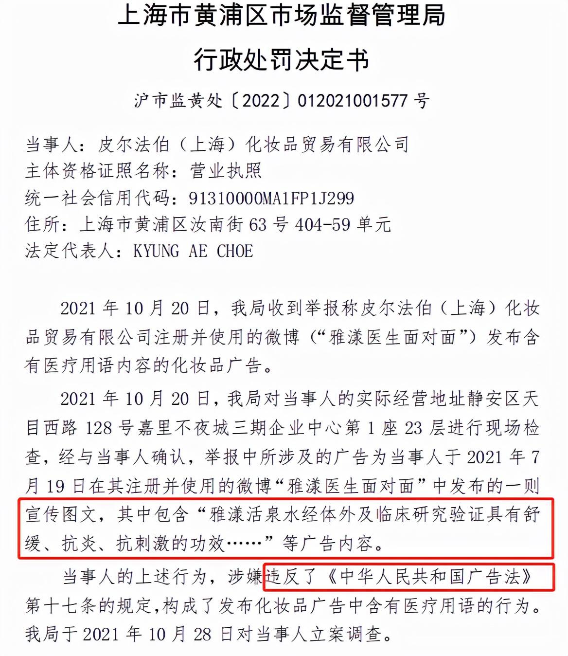2022年1月26日,Avene雅漾品牌中國運(yùn)營主體皮爾法伯(上海)化妝品貿(mào)易有限公司被上海市黃浦區(qū)市場監(jiān)督管理局罰款10萬元。