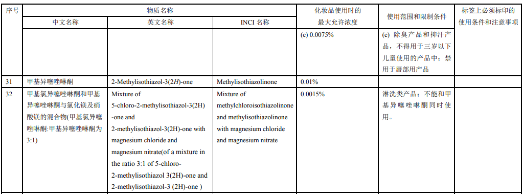 化妝品技術(shù)規(guī)范(2015年版)規(guī)定,甲基氯異噻唑啉酮和甲基異噻唑啉酮與氯化鎂及硝酸鎂的混合物(甲基氯異噻唑啉酮:甲基異噻唑啉酮為 3:1),在化妝品中使用時(shí)的大允許濃度為0.0015%,適用于淋洗類產(chǎn)品,且不能和甲基異噻唑啉酮同時(shí)使用。