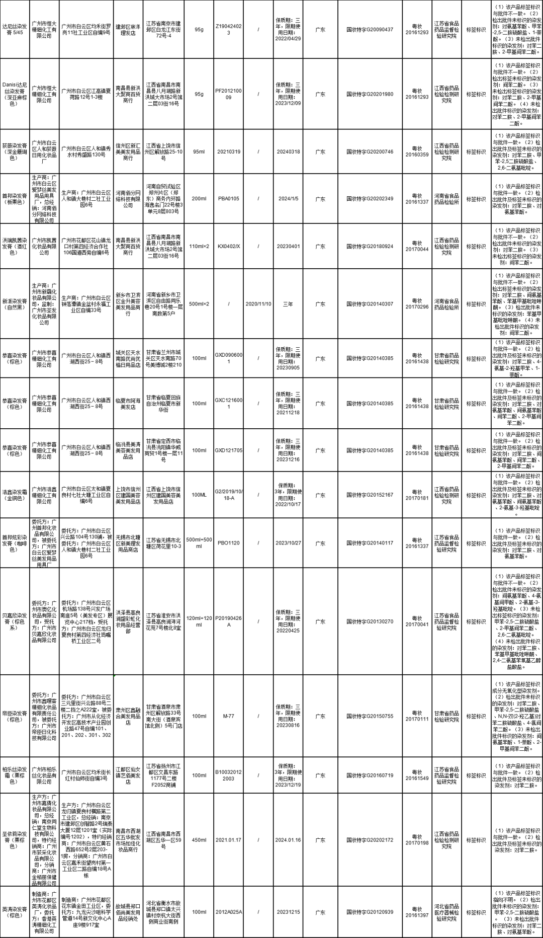 2022年1月17日,藥監(jiān)局發(fā)布了《關(guān)于71批次不合格化妝品的通告(2022年第6號)》,通報(bào)多款染發(fā)膏/染發(fā)劑含有對苯二胺,涉及達(dá)尼絲、荻薇、首邦、洪瑞凱茜、新派、恭喜、浩鑫、貝嘉欣、帝臣、柏樂絲、英濤等品牌。