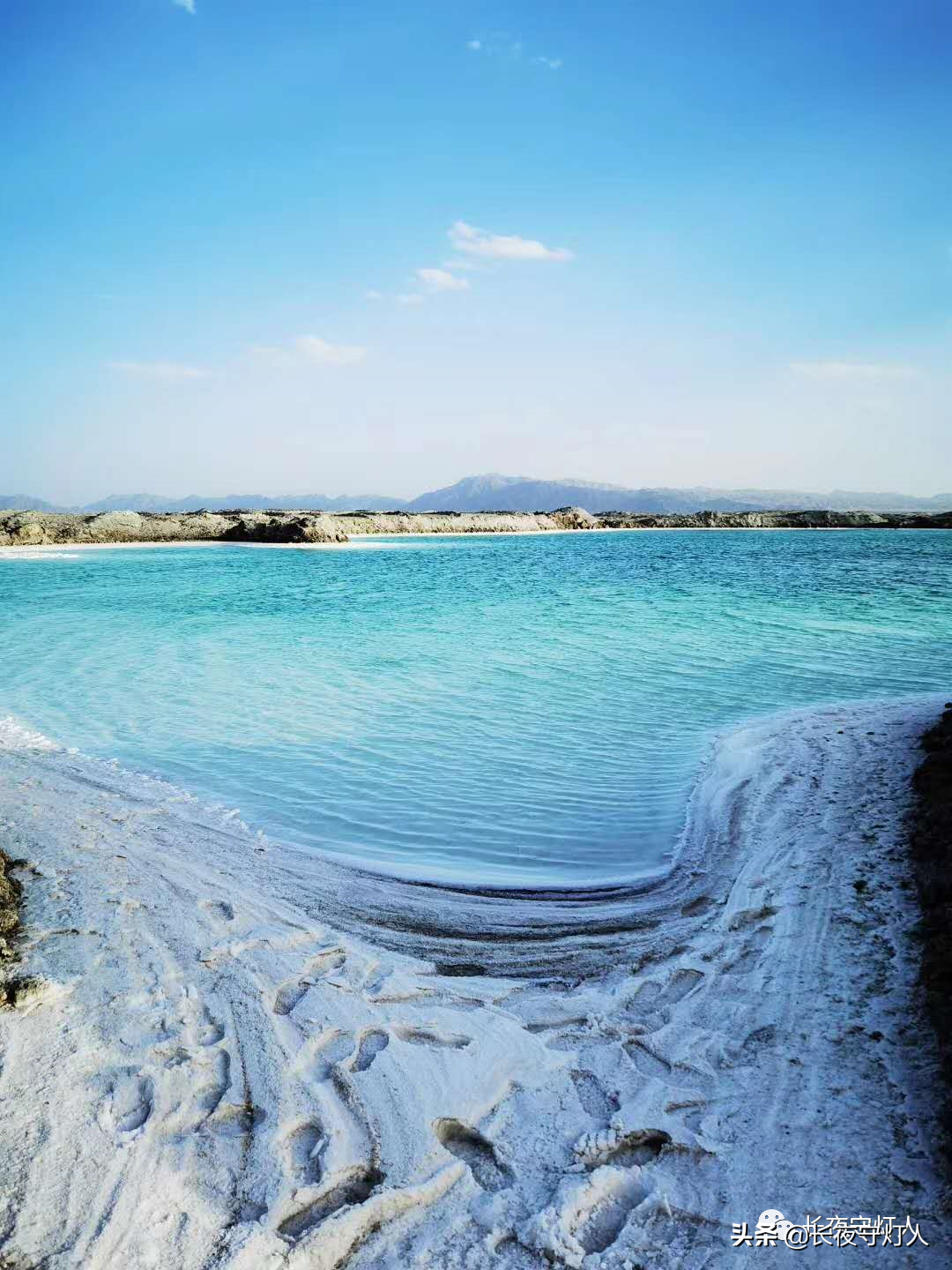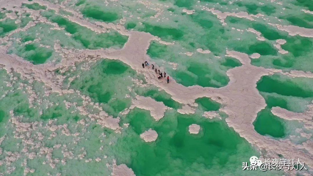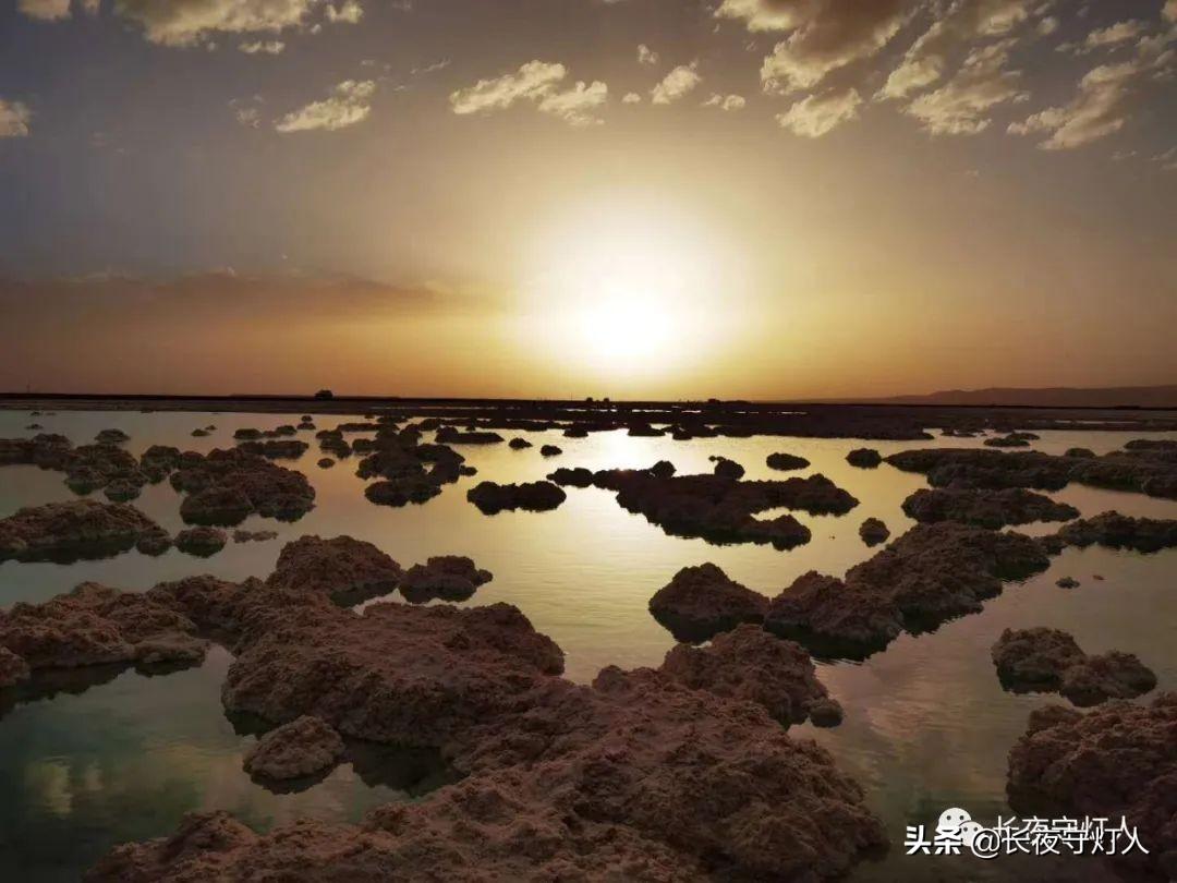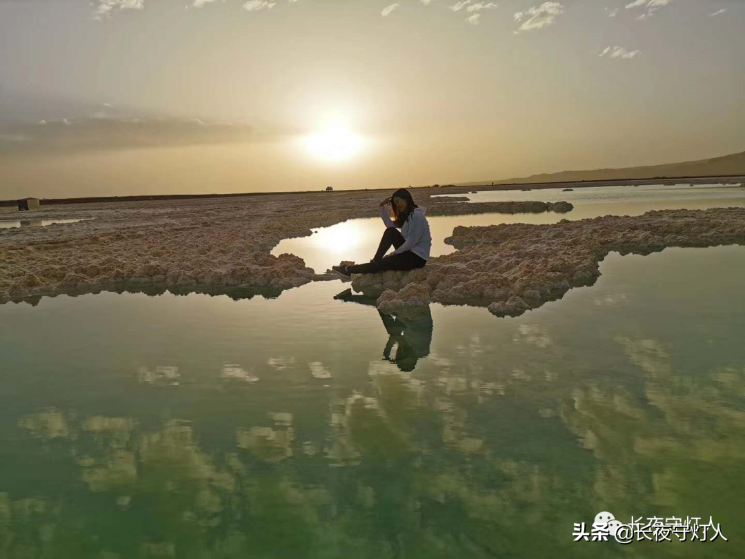 茫崖翡翠湖是我們此行的第一個翡翠湖,有牌子“茫崖翡翠湖”。湖被鹽堿分割成個小塊,或者說在個鹽堿坑里形成了個小湖。鹽堿很結(jié)實,可以在湖里隨意走,日落很美。