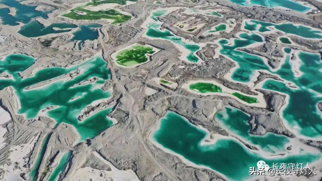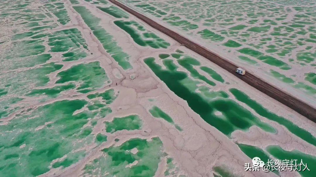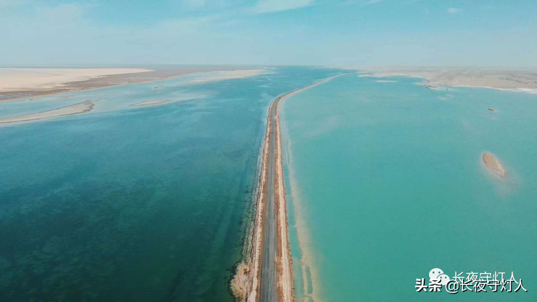 出水上雅丹不久,就到了雙色湖,雙色湖其實就是西臺吉乃爾湖。穿湖而過的公路把湖分成兩半,兩邊的顏色不同,一邊偏綠,一邊偏藍(lán)(說到顏色我又詞窮了)。無人機(jī)航拍果。