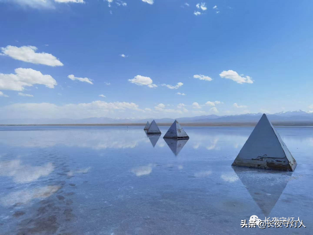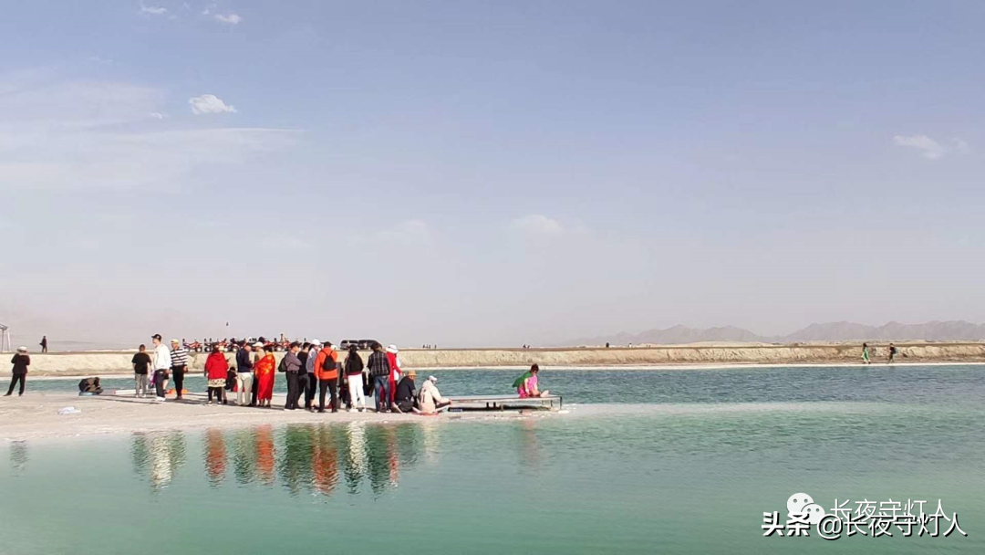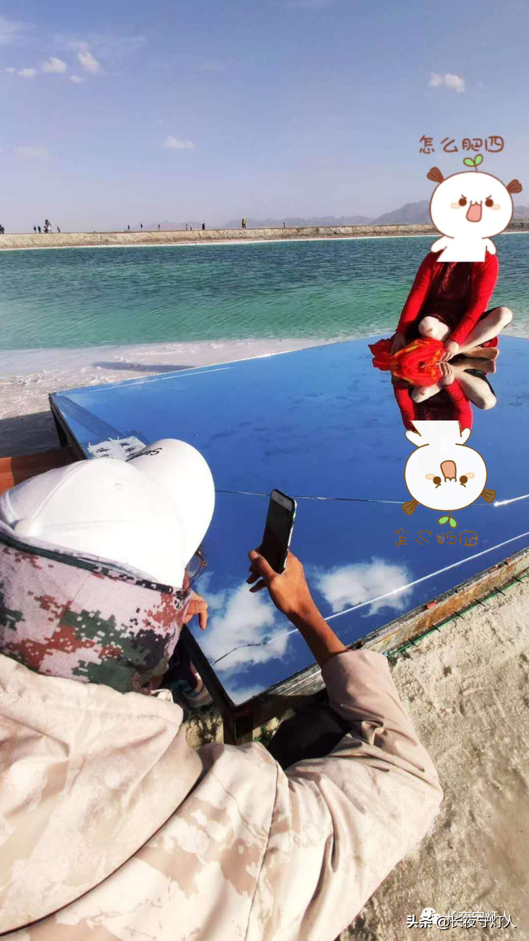 傍晚到達(dá)大柴旦翡翠湖。人們一般說的青海翡翠湖,指的就是大柴旦翡翠湖,所以這個湖的牌子只有“翡翠湖”三個字,不像“茫崖翡翠湖”。這個景區(qū)可能太過火爆,游客很多,大媽版的天空之鏡讓我大跌眼鏡,卻排著長隊。所謂的天空之境,居然是在湖邊架起了一塊玻璃,于是可以無視天氣,無視風(fēng)浪。另外還有簡易版的天空之鏡,道具只需一面鏡子,隨處都是天空之鏡。