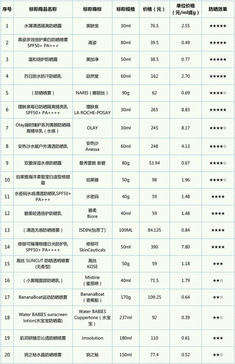 10、蘇菲娜藍(lán)蕾絲防曬霜9、近江兄弟小熊防曬防水防汗紅色防曬霜8、fancl透亮防曬隔離露7、珂潤潤浸保濕防曬凝露6、Fancl無添加物理防曬隔離霜5、Badger天然物理嬰兒防曬霜(洋甘菊金盞花)4、碧柔水活防曬倍護(hù)水凝露3、薇諾娜清透防曬乳2、安耐曬小金瓶1、怡思丁多維光護(hù)沁融水感防曬霜【拓展資料】