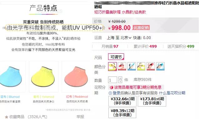 要知道明星熱衷的臺灣省某款天價防曬帽,售價998元1頂,詳情頁也只寫了「UPF50+」。