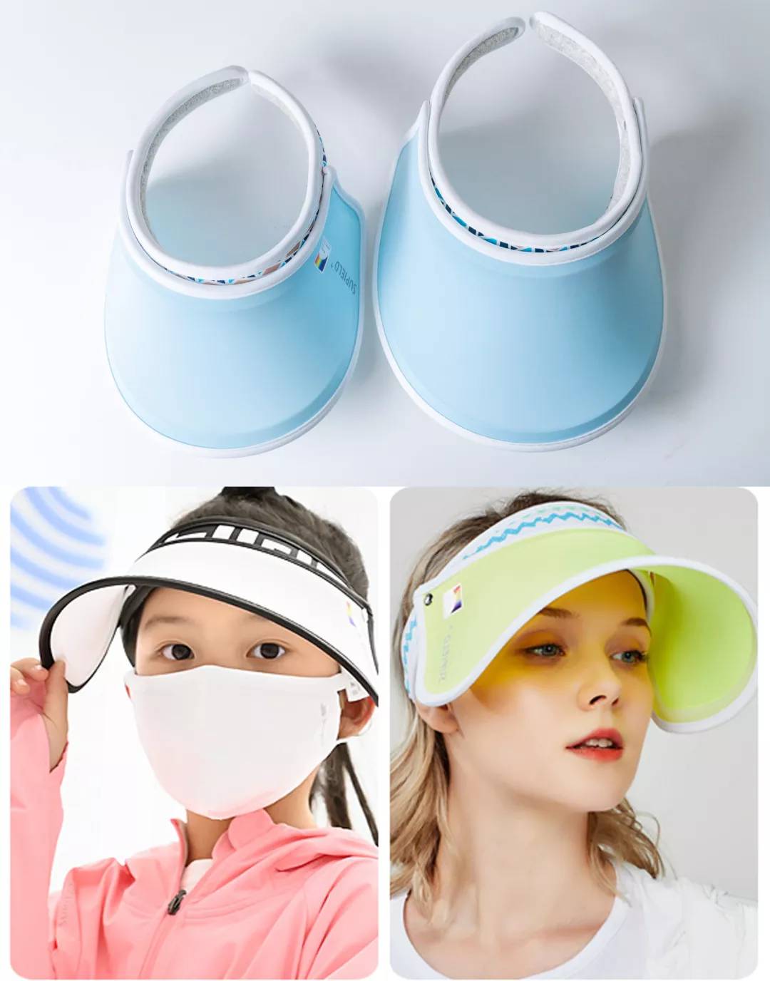 馬卡龍色,少女心顏色。粉、藍、白、熒光黃色,四個顏色都很青春亮麗,每款帽子都有自己的小設計,大家可以按照喜好選擇。