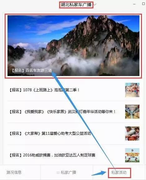 微信:微信搜索“湖北私家車廣播”,點(diǎn)擊底部菜單欄“私家活動”,點(diǎn)擊“【報名】百名車友游三清”
