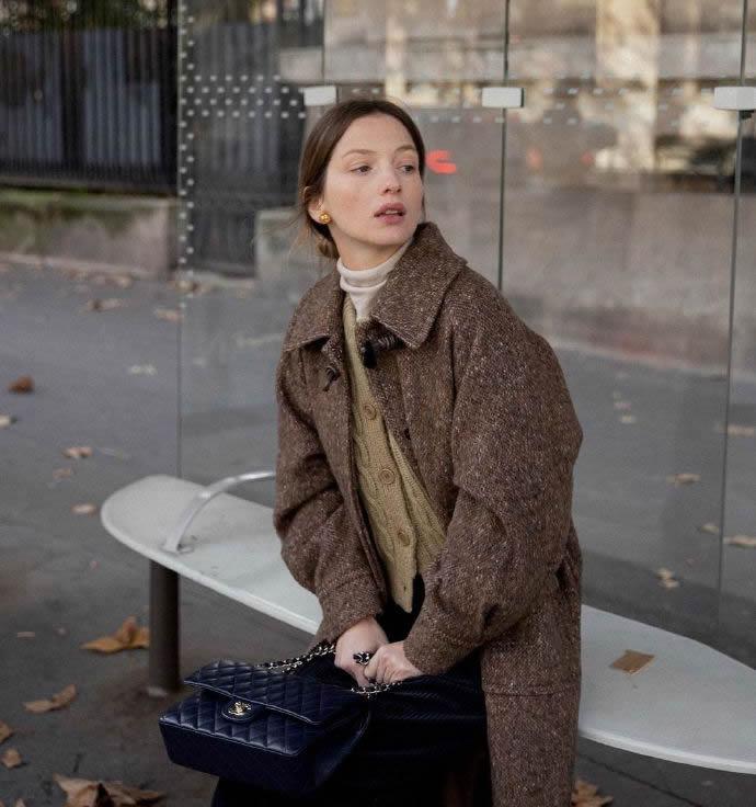 材質(zhì)對(duì)比營(yíng)造的層次,顯而易見。光澤皮革與普通面料的博弈,反光差異之下格外。皮質(zhì)柔軟細(xì)膩,少硬朗,保溫柔,乃是法式風(fēng)成功的精髓。