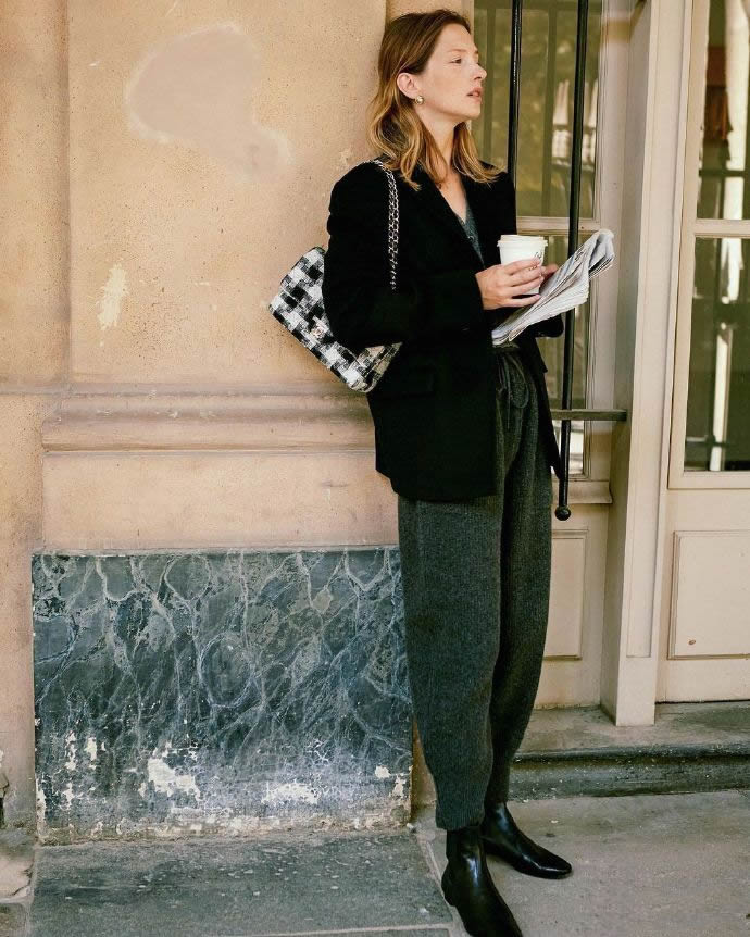 推崇極簡(jiǎn)的時(shí)髦精,往往會(huì)對(duì)高級(jí)感情有獨(dú)鐘?;疑笠聝?nèi)搭一身黑,配色簡(jiǎn)單毫不起眼。但故意營(yíng)造的脖頸與耳環(huán),就是吸睛大招。