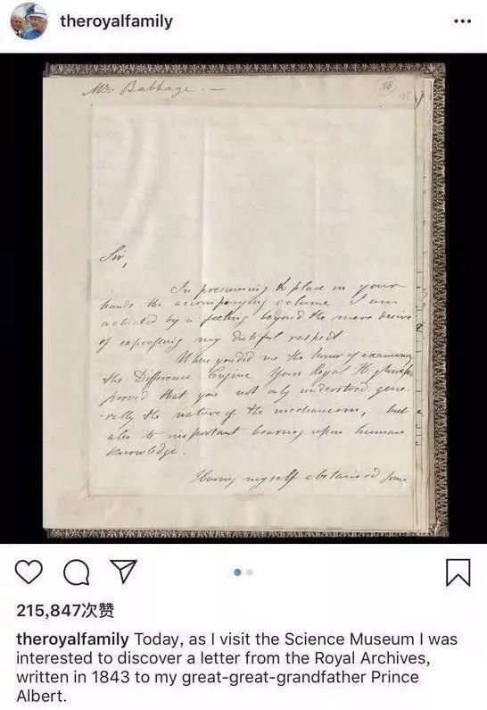 93歲的英國(guó)女王在參觀科學(xué)博物館之后,用iPad在皇室官方賬號(hào)上分享了數(shù)學(xué)家查爾斯·巴貝奇寫(xiě)給維多利亞女王丈夫阿爾伯特親王的信件圖片,并表達(dá)了自己當(dāng)下的感受。