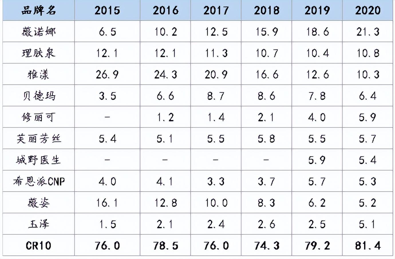 從競(jìng)爭(zhēng)格局上看,我國(guó)皮膚學(xué)級(jí)護(hù)膚品行業(yè)集中度高,且本土品牌更具成長(zhǎng)性。2020 年,我國(guó)皮膚學(xué)級(jí)市場(chǎng) CR10 合計(jì)市占率 81.4%,高于皮膚學(xué)級(jí)市場(chǎng) CR10 的 57.7%,嚴(yán)監(jiān)管下行業(yè)集中度有望進(jìn)一步提高。從國(guó)內(nèi)前十品牌排名變化來(lái)看,薇諾娜作為敏感肌護(hù)膚國(guó)貨龍頭,市占率由 2015 年的 6.5%一路攀升至 2020 年的 21.3%,成功實(shí)現(xiàn)彎道超車(chē),2019 和 2020 年在國(guó)內(nèi)皮膚學(xué)級(jí)護(hù)膚品市場(chǎng)市占率連續(xù)排名第 1;另一國(guó)貨品牌玉澤也以 5.1%的市占率躋身2020 年國(guó)內(nèi)皮膚學(xué)級(jí)護(hù)膚品市場(chǎng)前十;國(guó)外品牌總體市場(chǎng)份額呈下滑態(tài)勢(shì)。皮膚學(xué)級(jí)護(hù)膚品強(qiáng)調(diào)功性和性,消費(fèi)者品牌忠誠(chéng)度高,且本土品牌更加了解國(guó)人膚質(zhì)和消費(fèi)習(xí)慣,相對(duì)海外品牌更具市場(chǎng)競(jìng)爭(zhēng)力及品牌成長(zhǎng)性。