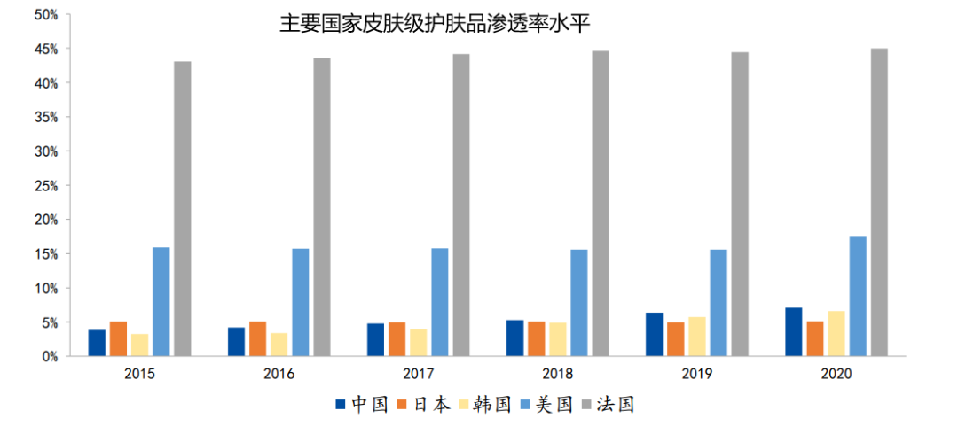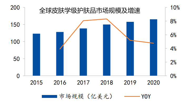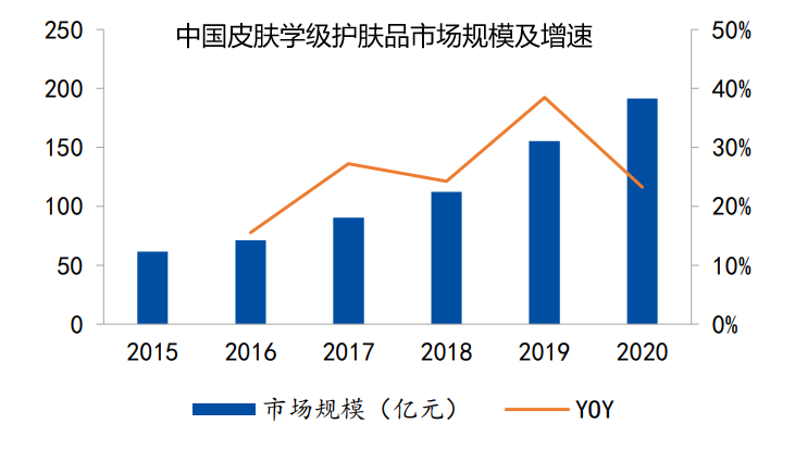 國(guó)內(nèi)皮膚學(xué)級(jí)護(hù)膚品市場(chǎng)兼具高增速和低滲透,發(fā)展空間廣闊。皮膚學(xué)級(jí)護(hù)膚品主要指采用溫和科學(xué)的配方,強(qiáng)調(diào)產(chǎn)品性和專業(yè)性,適用于肌膚敏感等問(wèn)題的肌膚護(hù)理產(chǎn)品。隨著生活水平的提高及消費(fèi)理念趨于成熟,消費(fèi)者對(duì)于產(chǎn)品成分的關(guān)注度不斷提升,皮膚學(xué)級(jí)護(hù)膚品的市場(chǎng)需求也不斷增長(zhǎng)。根據(jù)Euromonitor 統(tǒng)計(jì)數(shù)據(jù),2020 年皮膚學(xué)級(jí)護(hù)膚品市場(chǎng)規(guī)模 165.21 億美元,2015-2020 年 CAGR 為 6.0%;我國(guó)皮膚學(xué)級(jí)護(hù)膚品市場(chǎng)規(guī)模由 2015 年的61.44 億元增至 2020 年的 191.51 億元,CAGR 達(dá) 25.5%,高出增速19.5pct,且遠(yuǎn)高于護(hù)膚品整體市場(chǎng)的發(fā)展增速。在亞洲地區(qū),主要市場(chǎng)的皮膚學(xué)級(jí)護(hù)膚品滲透率仍大幅低于歐美等成熟市場(chǎng)。2020 年美國(guó)/法國(guó)皮膚學(xué)級(jí)護(hù)膚品市場(chǎng)滲透率(即皮膚學(xué)級(jí)護(hù)膚品占護(hù)膚品市場(chǎng)比例)分別為17.4%/45%,中國(guó)/日本/韓國(guó)分別為 7.1%/5.1%/6.6%,我國(guó)皮膚學(xué)級(jí)護(hù)膚市場(chǎng)滲透率仍有數(shù)倍的提升空間。