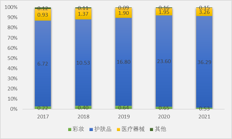 公司產(chǎn)品主要包括霜、護(hù)膚水、面膜、精華以及乳液等護(hù)膚品類產(chǎn)品及隔離霜、BB霜以及卸妝水等彩妝類產(chǎn)品。除護(hù)膚品和彩妝外,公司還從事皮膚護(hù)理相關(guān)醫(yī)療器械產(chǎn)品的研發(fā)、生產(chǎn)以及銷售業(yè)務(wù),相關(guān)產(chǎn)品主要包括透明質(zhì)酸修護(hù)生物膜、透明質(zhì)酸修護(hù)貼敷料等,主要用于微創(chuàng)術(shù)后屏障受損皮膚的保護(hù)和護(hù)理。