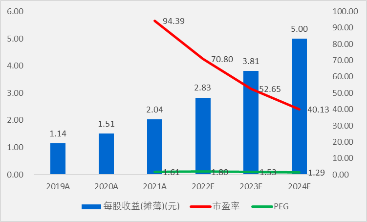 根據(jù)機(jī)構(gòu)一致性預(yù)測(cè),貝泰妮2024年業(yè)績(jī)?cè)鏊僭?1.18%左右,EPS為5.00元,19-24年5年復(fù)合增長(zhǎng)率38.80%。目前股價(jià)201.10元,對(duì)應(yīng)2024年估值是PE 40.13倍左右,PEG 1.29左右。