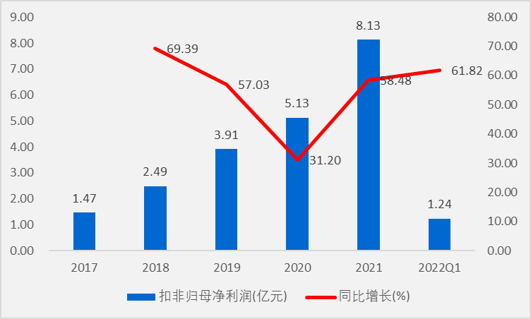 2022Q1公司實(shí)現(xiàn)營(yíng)收同比增長(zhǎng)59.32%至8.09億元;實(shí)現(xiàn)歸母凈利潤(rùn)同比增長(zhǎng)85.74%至1.46億元;實(shí)現(xiàn)扣非歸母凈利潤(rùn)同比增長(zhǎng)61.82%至1.24億元;實(shí)現(xiàn)經(jīng)營(yíng)活動(dòng)現(xiàn)金流同比下降429.12%至-1.67億元。