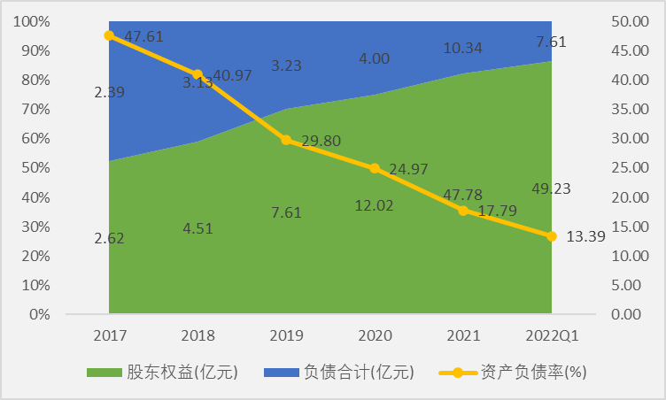 截止2021年Q1,公司總資產(chǎn)56.84億元,股東權(quán)益49.23億元,負(fù)債總額7.61億元,資產(chǎn)負(fù)債率13.39%;負(fù)債方面,流動(dòng)負(fù)債6.25億元,占比82.13%,非流動(dòng)負(fù)債1.35億元,占比17.74%;資產(chǎn)方面,流動(dòng)資產(chǎn)50.21億元,占比88.34%,非流動(dòng)資產(chǎn)6.63億元,占比11.66%。