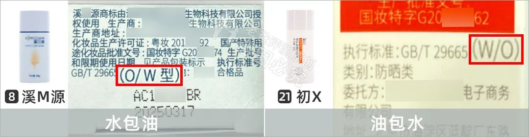 這里還有個小知識點:國產(chǎn)品牌防曬霜包裝上可以找到執(zhí)行標準:GB/T 29665,注意看后面括號里的字母。如果是(O/W)則為水包油型,反之,(W/O)則為油包水型。