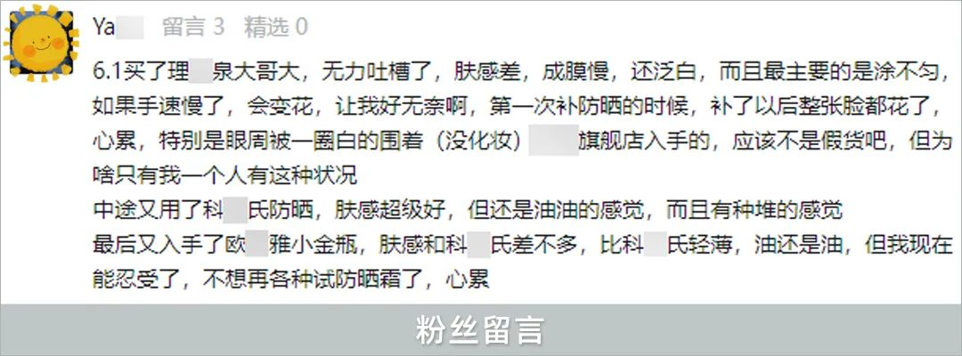 二、防曬力和膚感只能二選一?我們在征集時,看到了這樣的留言:某品牌防曬霜成膜慢、泛白還涂不勻,讓人心累