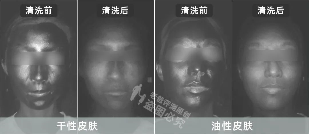 下午 6 點用同一款清潔力中等的氨基酸洗面奶進行清洗,并再次用紫外線相機拍照,通過前后兩張照片對比,判斷是否可以清洗干凈。