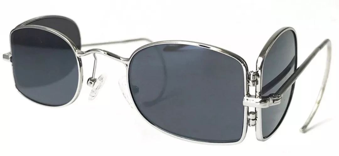 1797 年,一位名叫 George Richards Elkington 的英國(guó)人提出了一項(xiàng)很特別的眼鏡專利,是一副擁有四片鏡片的眼鏡,在普通鏡片之上,接多兩塊鏡片,這是為了阻擋側(cè)光的設(shè)計(jì),同時(shí)也可以折疊起來(lái),加上前方鏡片的阻光能力,這種被稱為 “鐵路眼鏡” 的鏡片,是多年之后發(fā)展出來(lái)太陽(yáng)眼鏡的前身。