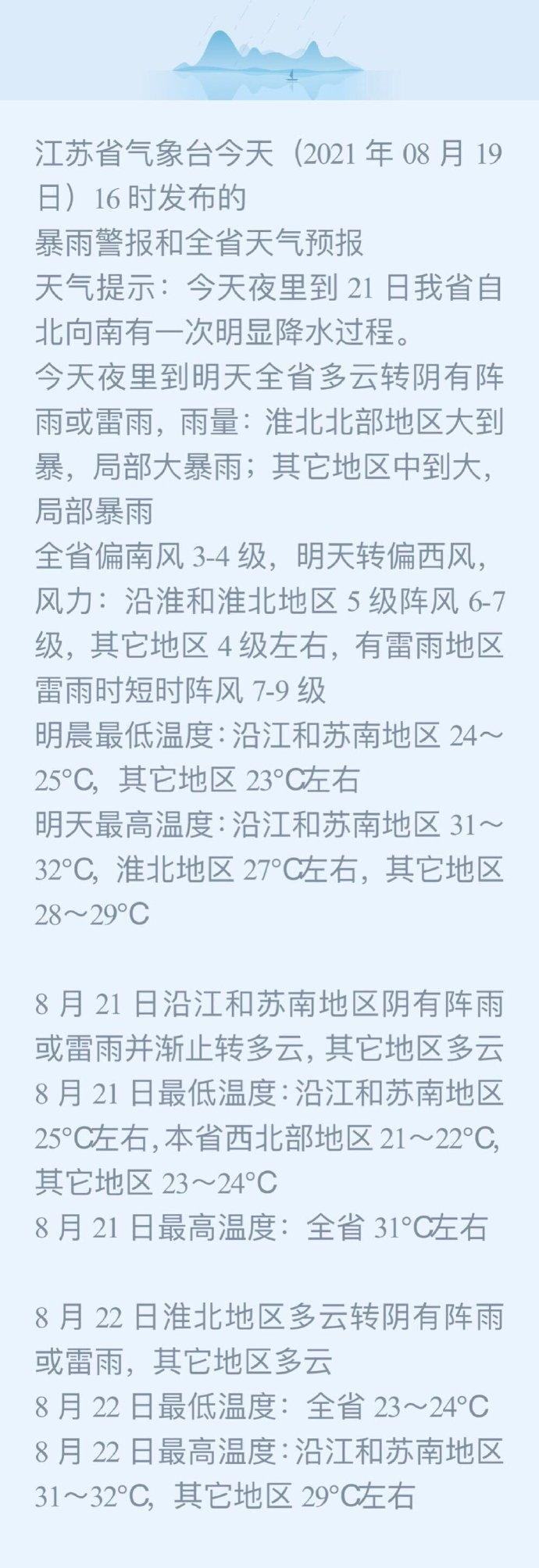 【暴雨警報】今天夜里到21日我省自北向南有一次降水過程。今天夜里到明天全省多云轉(zhuǎn)陰有陣雨或雷雨,雨量:淮北北部地區(qū)大到暴,局部大暴雨;其它地區(qū)中到大,局部暴雨,全省偏南風(fēng)3-4級,明天轉(zhuǎn)偏西風(fēng),風(fēng)力:沿淮和淮北地區(qū)5級陣風(fēng)6-7級,其它地區(qū)4級左右,有雷雨地區(qū)雷雨時短時陣風(fēng)7-9級,明晨低溫度:沿江和蘇南地區(qū)24~25℃,其它地區(qū)23℃左右,明天高溫度:沿江和蘇南地區(qū)31~32℃,淮北地區(qū)27℃左右,其它地區(qū)28~29℃。