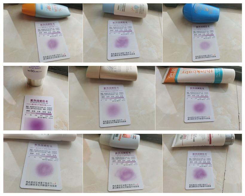 從紫外線感應(yīng)卡的深淺我們可以發(fā)現(xiàn),在防曬能力上表現(xiàn)的是資生堂藍胖子、安耐曬、蜜絲婷小黃帽,墊底的是黛珂和Thinkbaby。