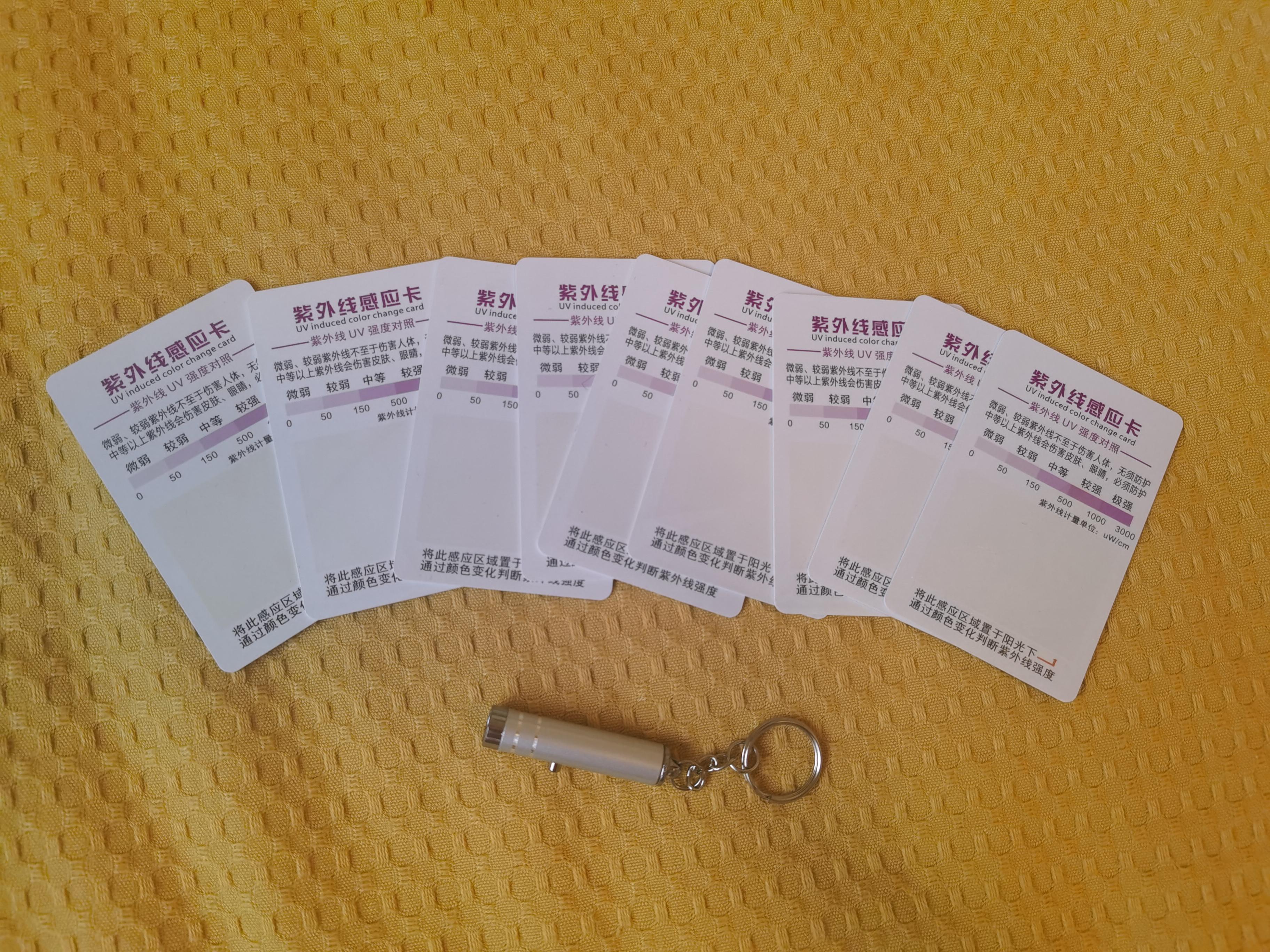 1、防曬能力測試樓主使用紫外線燈光筆代替陽光中的紫外線,每一款防曬霜分別對應(yīng)涂抹一張紫外線感應(yīng)卡,依次使用紫外線燈光筆在同等位置照射5秒后,對比卡片中的顏色變化,顏色越淺,則代表防曬能力越強。