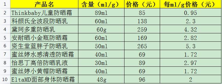 5、價格方面貴:資生堂藍胖子、黛珂,適中:安耐曬、怡思丁,便宜:Thinkbaby、蜜絲婷、EltaMD。