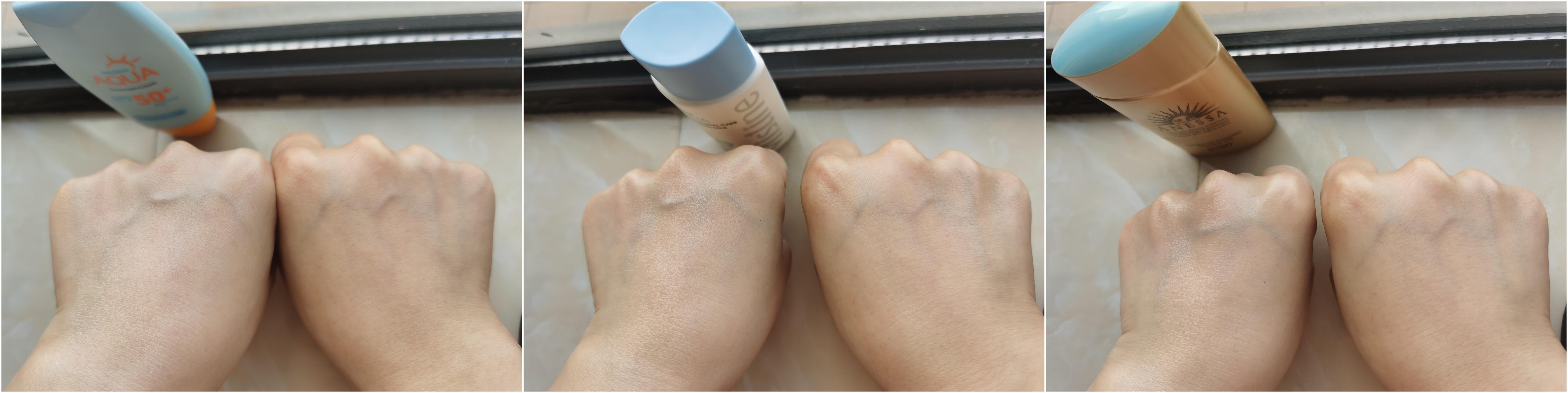 7、泛白情況測試樓主將防曬霜均勻地涂抹在左手手背上,靜待吸收后,與右手未擦防曬霜的手背進行對比。為了測試更為客觀,每款測試后及時清洗干凈手背后再進行下一款測試。下面再次有請9位佳麗出場表現(xiàn):