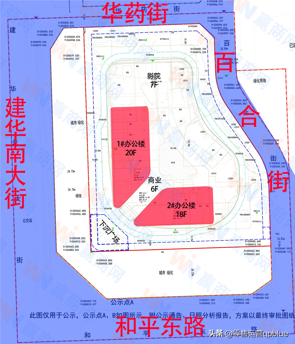 據(jù)項(xiàng)目總平面圖,東勝悅中心1號(hào)區(qū)共包含兩棟總高分別為20層、18層的辦公樓以及六層商業(yè),影院為7層;項(xiàng)目總占地18248.16平方米,總建面148702.42平方米,其中地上商業(yè)建面52857.5平方米、地下商業(yè)13394.33平方米。