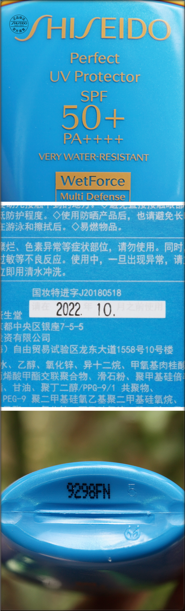 瓶身的英文標(biāo)注很霸氣:的紫外線防曬劑,保濕又耐水。對UVB的防御指數(shù)是高級別的50,對UVA的阻擋指數(shù)也是高標(biāo)準(zhǔn)的的四+,防曬指數(shù)適合夏日戶外的抗曬需求。試用的這瓶限期使用日期是2022年10月,很新鮮。瓶底的編號也與外盒一致。