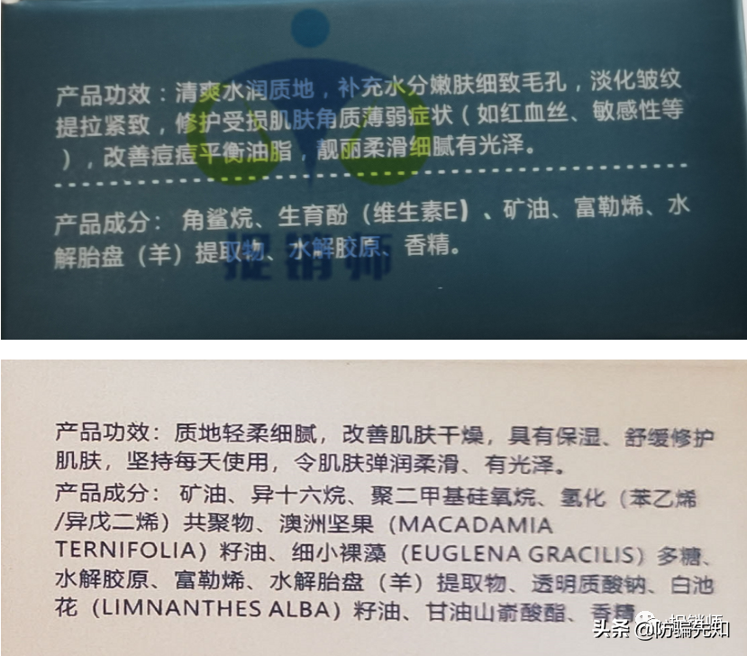 雅因璐胎盤(pán)素膠原修護(hù)精華霜備案的包裝平面圖顯示產(chǎn)品包裝主色為鵝黃色(下圖),而消費(fèi)者收到的實(shí)物產(chǎn)品外包裝為藍(lán)色(上圖)。通過(guò)對(duì)比發(fā)現(xiàn),雅因璐胎盤(pán)素膠原修護(hù)精華霜成分的備案成分與消費(fèi)者收到的雅因璐富勒烯水潤(rùn)修護(hù)精華液產(chǎn)品成分存在較大差異。