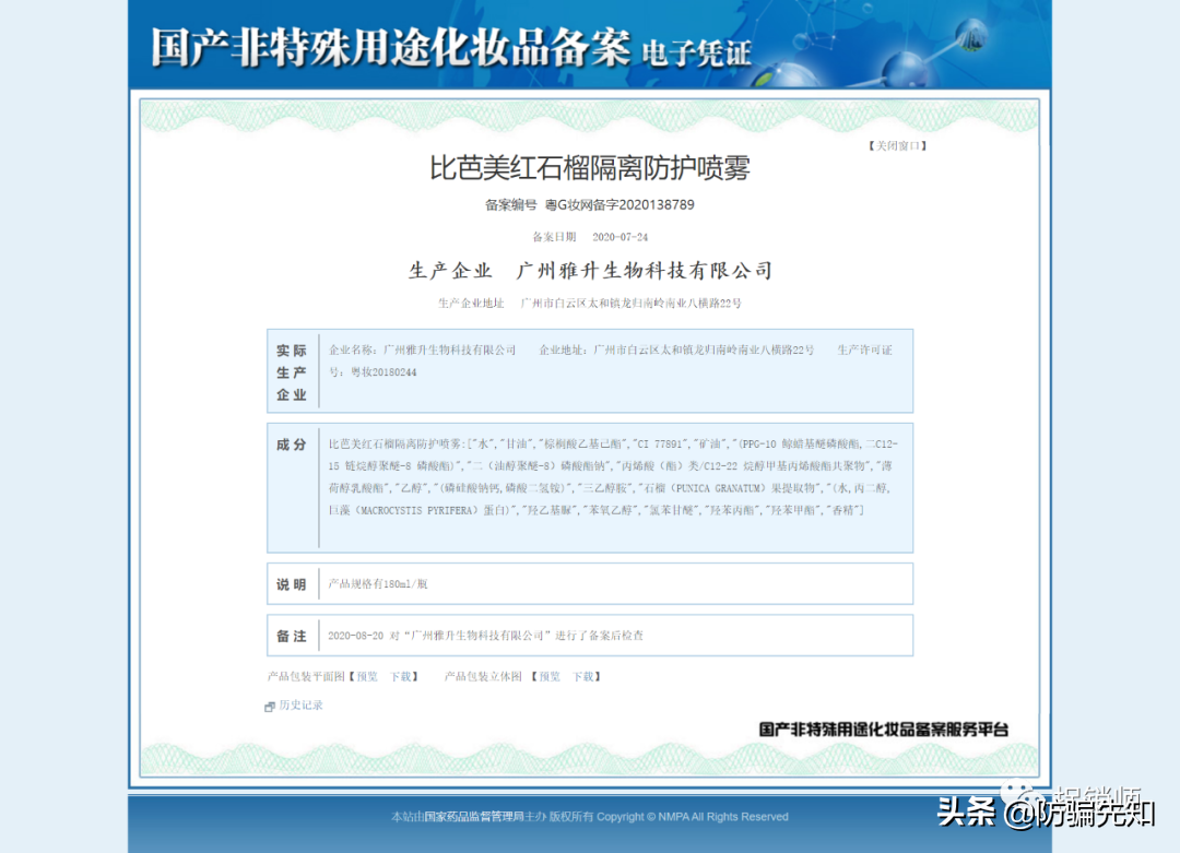 根據(jù)國(guó)產(chǎn)非特殊通途化妝品備案網(wǎng)站查詢(xún)可知,比芭美紅石榴隔離防護(hù)噴霧生產(chǎn)企業(yè)為廣州雅升生物科技有限公司,備案編號(hào) 粵G妝網(wǎng)備字2020138789,生產(chǎn)許可證號(hào):粵妝20180244。