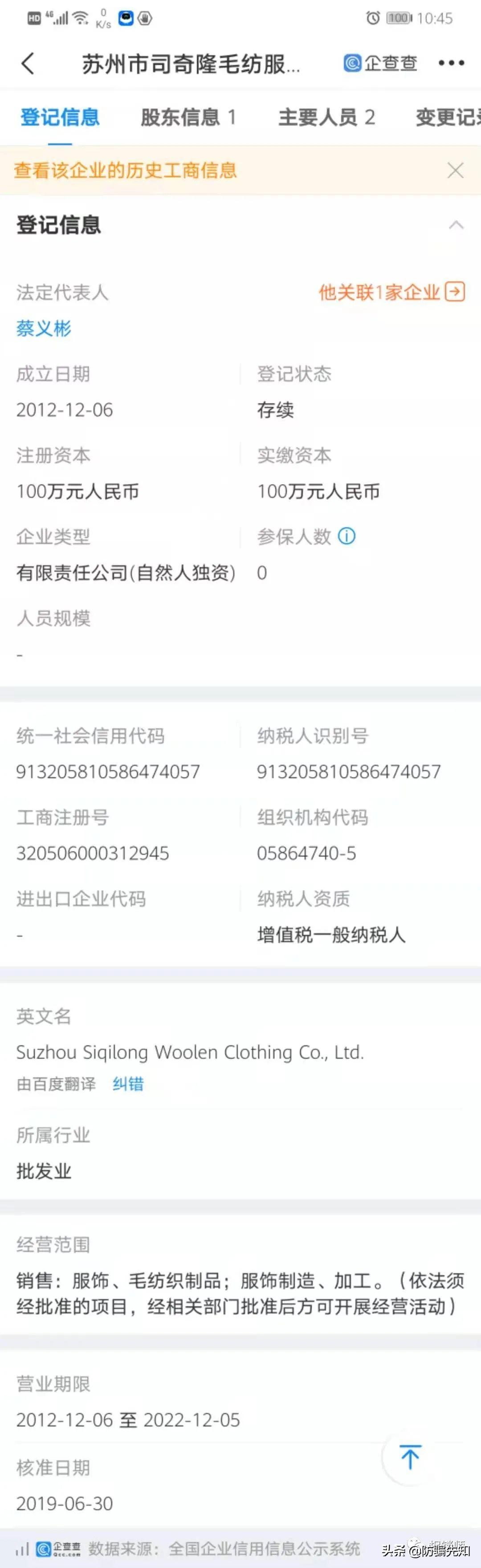 經(jīng)企查查APP查詢(xún),該商家全稱(chēng)為蘇州市司奇隆毛紡服飾有限公司,成立于2012年12月6日,法人蔡義彬(持股),經(jīng)營(yíng)范圍為服飾、毛紡織制品;服飾制造、加工。(依法須經(jīng)批準(zhǔn)的項(xiàng)目,經(jīng)相關(guān)部門(mén)批準(zhǔn)后方可開(kāi)展經(jīng)營(yíng)活動(dòng))