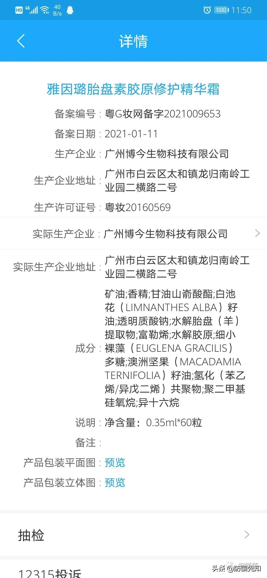 掃描條形碼出現(xiàn)的是一款名為雅因璐胎盤(pán)素膠原修護(hù)精華霜,生產(chǎn)企業(yè)廣州雅極化妝品有限公司,化妝品生產(chǎn)許可證號(hào):粵妝20160569。