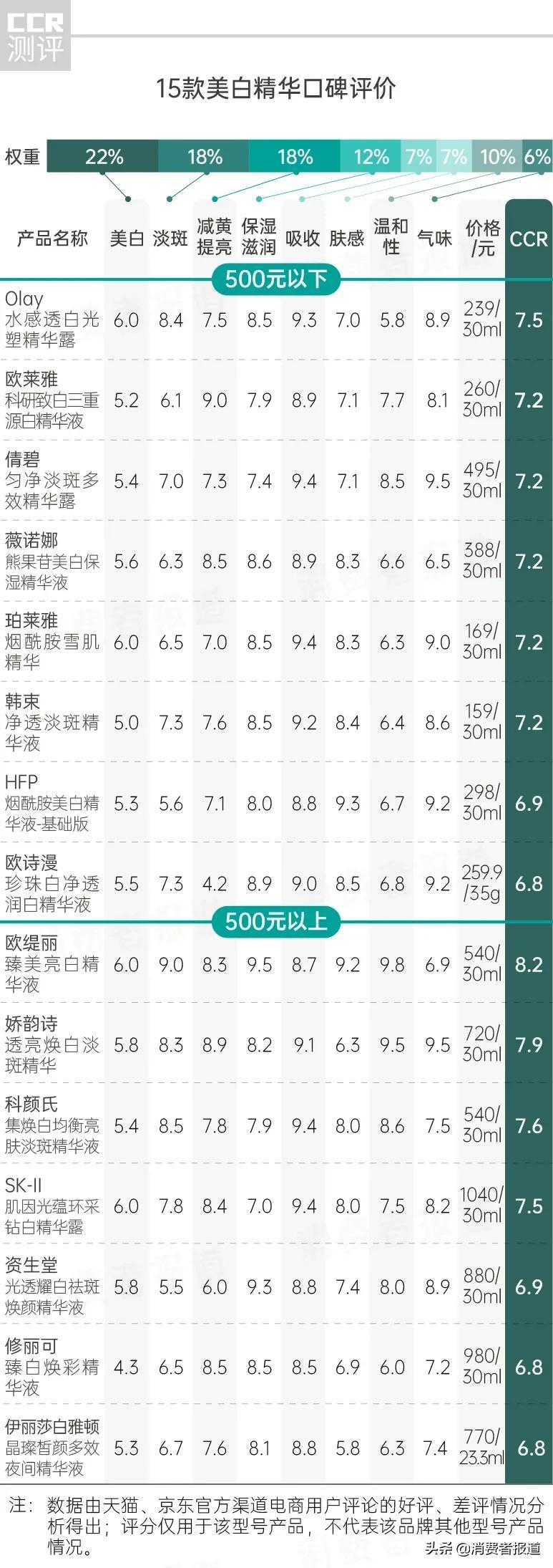 評(píng)價(jià)結(jié)果1.500元內(nèi)的美白精華中,Olay、歐萊雅、倩碧綜合評(píng)分較高;