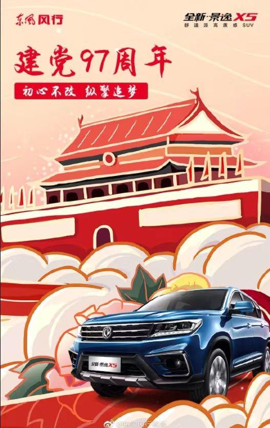 東風(fēng)風(fēng)行景逸X5在建黨97周年時打出“初心不改,縱擎追夢”的廣告語,進而顯示該款車型“舒適派高質(zhì)感SUV”的產(chǎn)品理念。