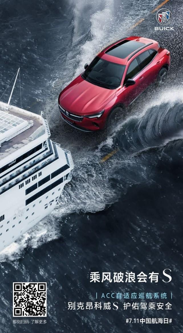 在2020年“中國航海日”,別克昂科威S打出了“前浪后浪,不如乘風(fēng)破浪 ”的標(biāo)語。在海報中,汽車行駛在海面上,兩側(cè)浪花翻涌,而別克昂科威S則一路乘風(fēng)破浪。