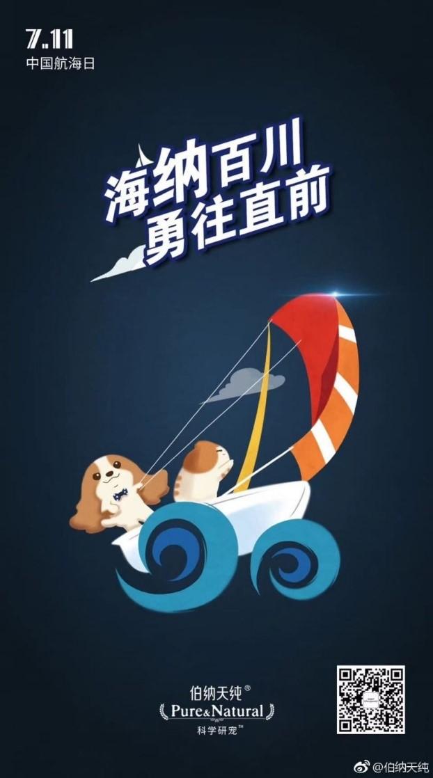 2018年的“中國航海日”,伯納天純打出了“海納百川,勇往直前”的標(biāo)語。在海報中,是兩只狗狗正在揚帆起航的畫面,既結(jié)合了“航海”這一特點,也與品牌自身從事寵物食品行業(yè)這一特點相結(jié)合。