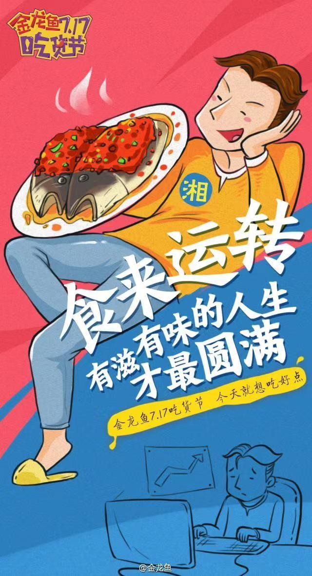 金龍魚“7·17”營銷海報中,是一個人在享受美食的形象,而餐盤中的“魚”也與“金龍魚”的“魚”相呼應(yīng)。同時魚也是一道美食,表明金龍魚可以烹飪出美食這一特點,營銷生動形象。