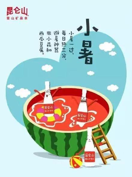 昆侖山雪山礦泉水在小暑時的營銷海報將半個西瓜進行創(chuàng)意繪畫,做成一個泳池的樣子,同時礦泉水則像人一樣在西瓜泳池中游泳,再配上藍天白云和排球,充滿夏天的氣息。