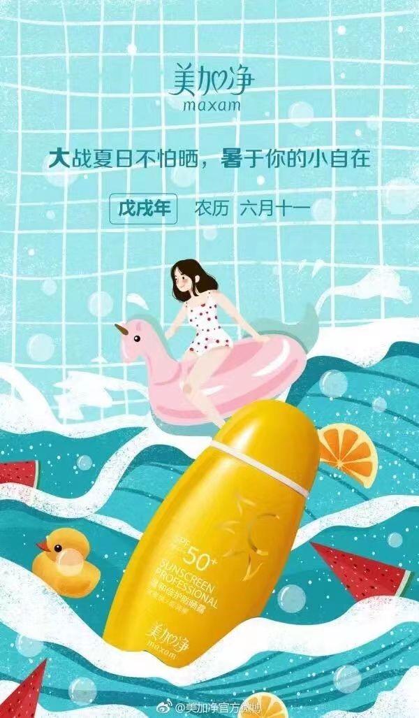 美加凈大暑時的營銷海報以藍色海洋為背景,描繪了一個女孩在海邊沖浪的情景。在營造夏日海灘生活的同時,突出自己的產(chǎn)品防曬霜。夏日不怕曬,只要使用了防曬霜,就可以有屬于自己的小自在。