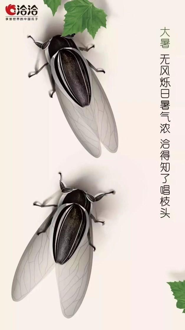 洽洽在大暑時的營銷,海報設(shè)計以兩只知了為主體,同時標(biāo)語中的“洽”字呼應(yīng)了品牌自身。夏日暑氣重,知了唱枝頭,一起“洽”瓜子吧!