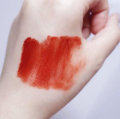 剛上唇就是那種唇釉的質(zhì)地,之后很快會變成啞光感的,一點(diǎn)也不拔干。這支真的算橙紅色系口紅里面很特別的一支了,重點(diǎn)!我一直都沒有找到這支的替代色,所以你們懂它的美。