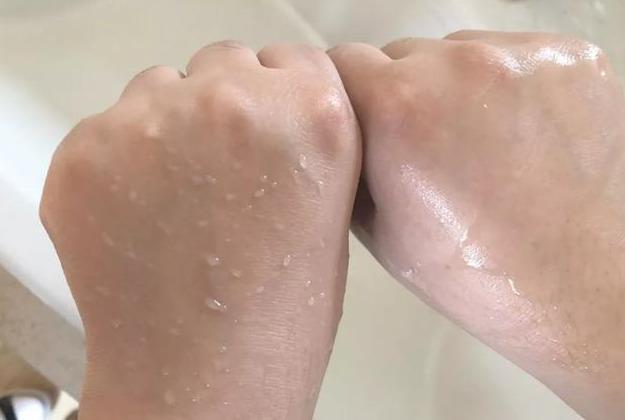 ▽左手擦防曬霜,用水沖完手背上是水珠,代表防曬霜并沒被洗掉,而右手沒有擦防曬,手背上的水形成不了水珠