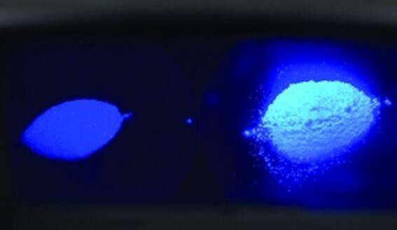 其實(shí),這樣的說法不無道理,在紫外線下能發(fā)出熒光的成分不只有熒光劑,有些防曬劑、水楊酸等也會發(fā)熒光,但是可以區(qū)分的是,這類成分發(fā)出的光很微弱(下圖右邊亮白色含熒光劑),而熒光劑石亮藍(lán)白色。