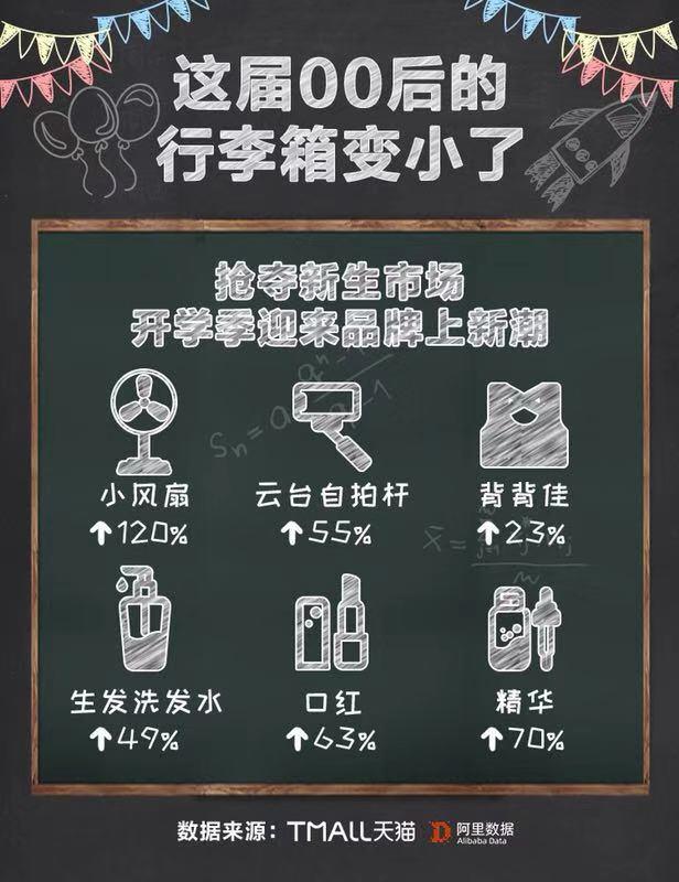 不過,與80后、90后相比,00后的開學(xué)裝備雖然越來越貴,但他們的行李箱卻沒有因此變大。天貓數(shù)據(jù)顯示,小于24寸的登機行李箱在開學(xué)前夕迎來一波銷售高峰。由于網(wǎng)購在年輕人中越來越普及,許多大一新生開學(xué)人未到,包裹已經(jīng)“先聲奪人”。天貓上的被褥、毛毯、換季服裝銷量迎來增長,這些訂單的收件地址中,高校占據(jù)了很大比例。