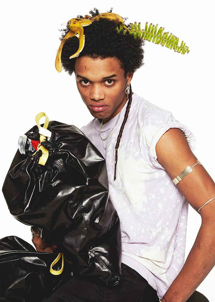 ▲BIIS 的 Bin Bag 宣傳照,模特頭頂和袋子里都是垃圾. 圖片來(lái)自:BuzzFeed