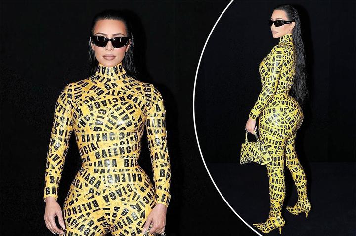 在這款垃圾袋初次亮相的走秀那天,金·卡戴珊也到了現(xiàn)場(chǎng),而且從脖子到腳纏上了印滿巴黎世家 logo 的黃色膠帶。