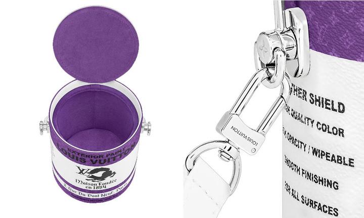 為了讓包包更像油漆罐,就連在細(xì)節(jié)的設(shè)計(jì)上,LV 也力求。包包側(cè)面印有「高品質(zhì)顏色」和「光滑飾面」廣告標(biāo)語(yǔ)。在接近桶底的地方,還特地寫上「警告:小心輕放」。