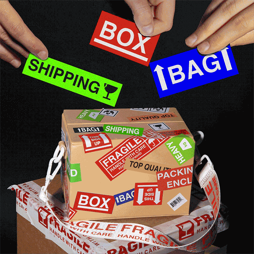 除了準(zhǔn)備了已經(jīng)印好 UV 標(biāo)簽的版本,還另外提供了一個(gè) DIY 版本——買家會(huì)收到一個(gè)干凈的快遞紙箱和一包貼紙,自己貼出的快遞箱包包